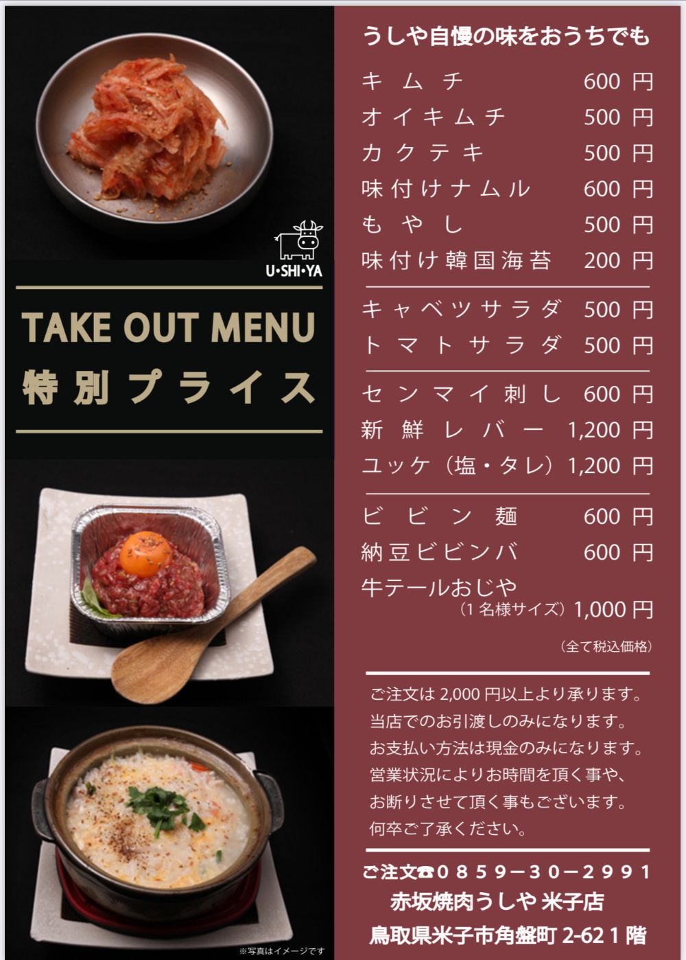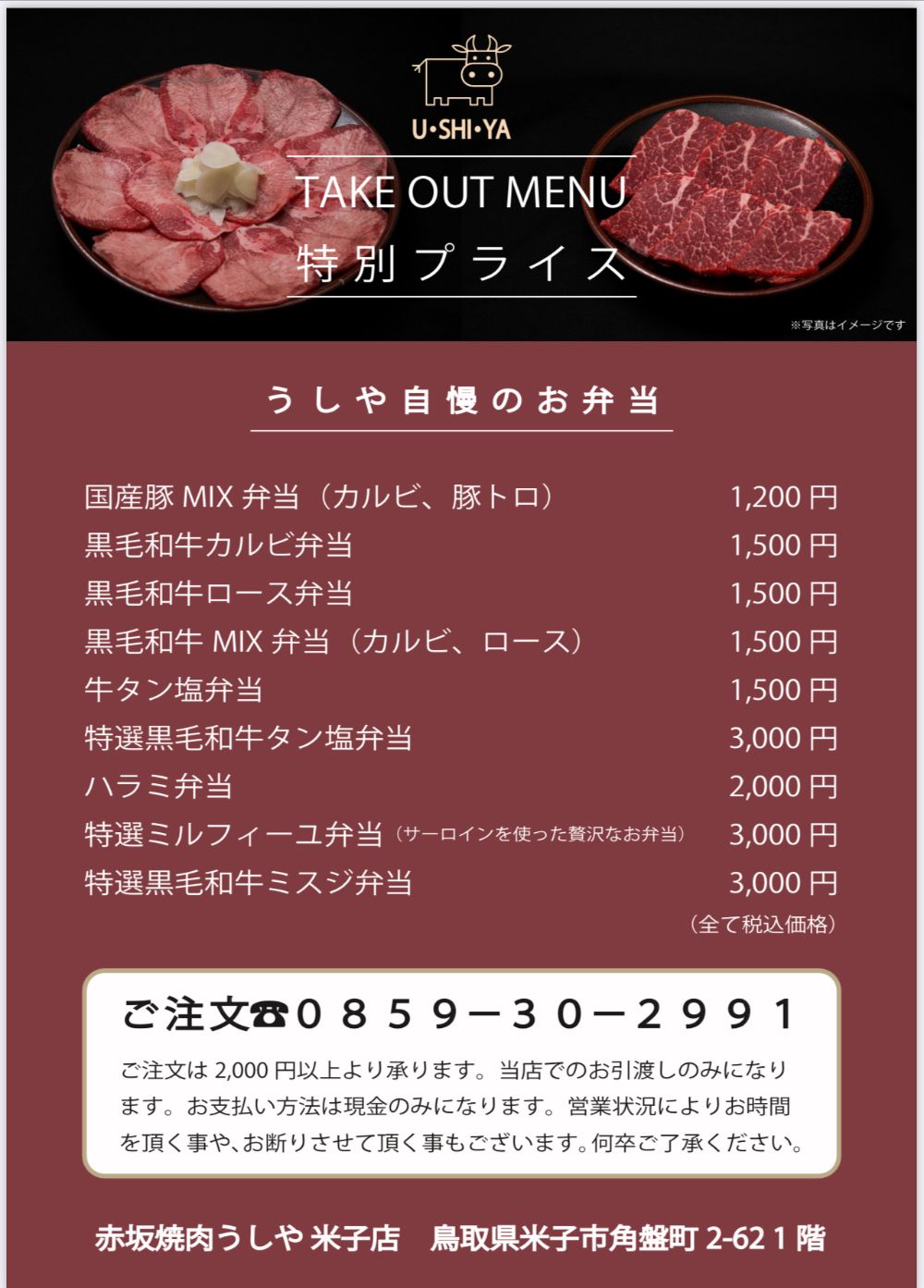 【赤坂焼肉うしや@米子店】 〒683-0812 鳥取県米子市角盤町2-62 グッドワン角盤町1F 0859-30-2991 お電話&LINEからご予約可能です。 お気軽にお問合せください。 ご予約お待ちしております!!! <本店はコチラ> ↓↓↓ 【赤坂焼肉うしや@赤坂本店】 〒107-0052 東京都港区赤坂2-15-18 西山興業赤坂ビル2F 03-5101-2989