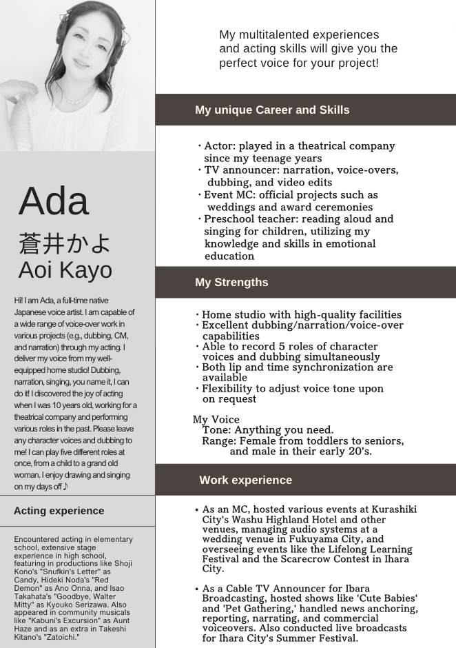 I offer English narration with a Japanese accent, as well as Japanese character voices, e-learning narration, and corporate introduction narration! My team of talented voice actors will bring your project to life in Japanese. I also provide Japanese localization services.