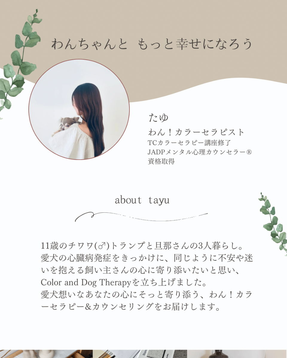 「わん!カラーセラピー™」および関連するすべてのセッション名・構成・文章・ビジュアル表現は、Color and Dog Therapy たゆ による完全オリジナルコンテンツです。無断転載・転用・模倣・類似名称の使用は、いかなる形であっても固くお断りいたします。