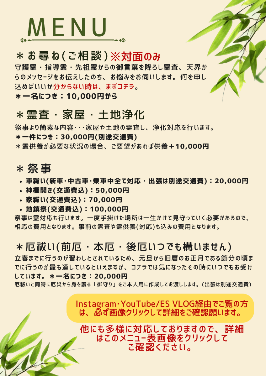 前世の自分との約束・・・。腹を括って、約束を守らなければならない。細々と活動しながらも抵抗し続けたのですが、訳あって2017年、あらためて祈祷師としての役目を全うすることを決意し、「萬屋事務局」バックアップの元活動中。日々修行を重ねて生きてます。 【これまでの実績】 お尋ね(相談事)、霊界天界からのメッセージ伝導、霊視、亡くなった人や動物との対話、霊供養(浄霊)、祈祷、お守りお札の作成、地鎮、土地浄化、家祓い、結界、仏壇(墓)引越し、自然(木、石など)との対話、厄祓い、心身の浄化(不具合緩和)、パワーストーンのエネルギー調整・ブレス完全オーダー製作、ペットとのコンタクト、療術(身体のメンテナンス)、萬屋講師