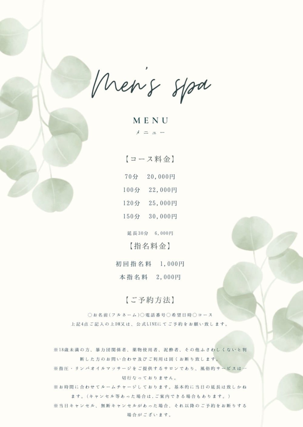 ♦注意事項アロマオイルマッサージのみを行っているリラクゼーションサロンです。 医療法が定める病院や診療所・治療院・按摩マッサージ・鍼灸による施術所ではございません。また、回春マッサージや風俗的なサービスは一切ございませんので予めご了承ください。♦禁止事項・18歳未満の方のご利用はできません。 ・暴言、嫌がらせ、性的サービスの強要は禁止しております。・大声を上げたり、他のお客様や近隣の迷惑になる行為を禁止しております。・泥酔されている方、薬物使用者のご利用を禁止しております。・個人的な連絡先交換や外へのお誘い、他店様の引抜きを目的とした行為は堅くお断りいたします。・盗撮、盗聴などの行為を禁止しております。・心臓疾患・伝染病・感染症(水虫・性病)にかかっている方・体調等の理由で欠席や遅刻等がある場合もございます。・万一、欠席した場合等は、キャンセルさせて頂く場合がございます。予めご了承ください。・無断キャンセルや、直前のキャンセル等繰り返された場合、ご予約をお取りできなくなります。・ご連絡なく10分以上予約時間を過ぎてしまうとキャンセル扱いになります。・また、ご連絡があった場合でも、コースのお時間を短縮させていただく事もございます。 コースの変更はできかねます。ご利用規約に対いて違反行為があった場合には施術中であっても退店して頂き、 次回からのご予約をお断りさせて頂き、返金致しかねますのでご理科頂きますようお願いいたします。