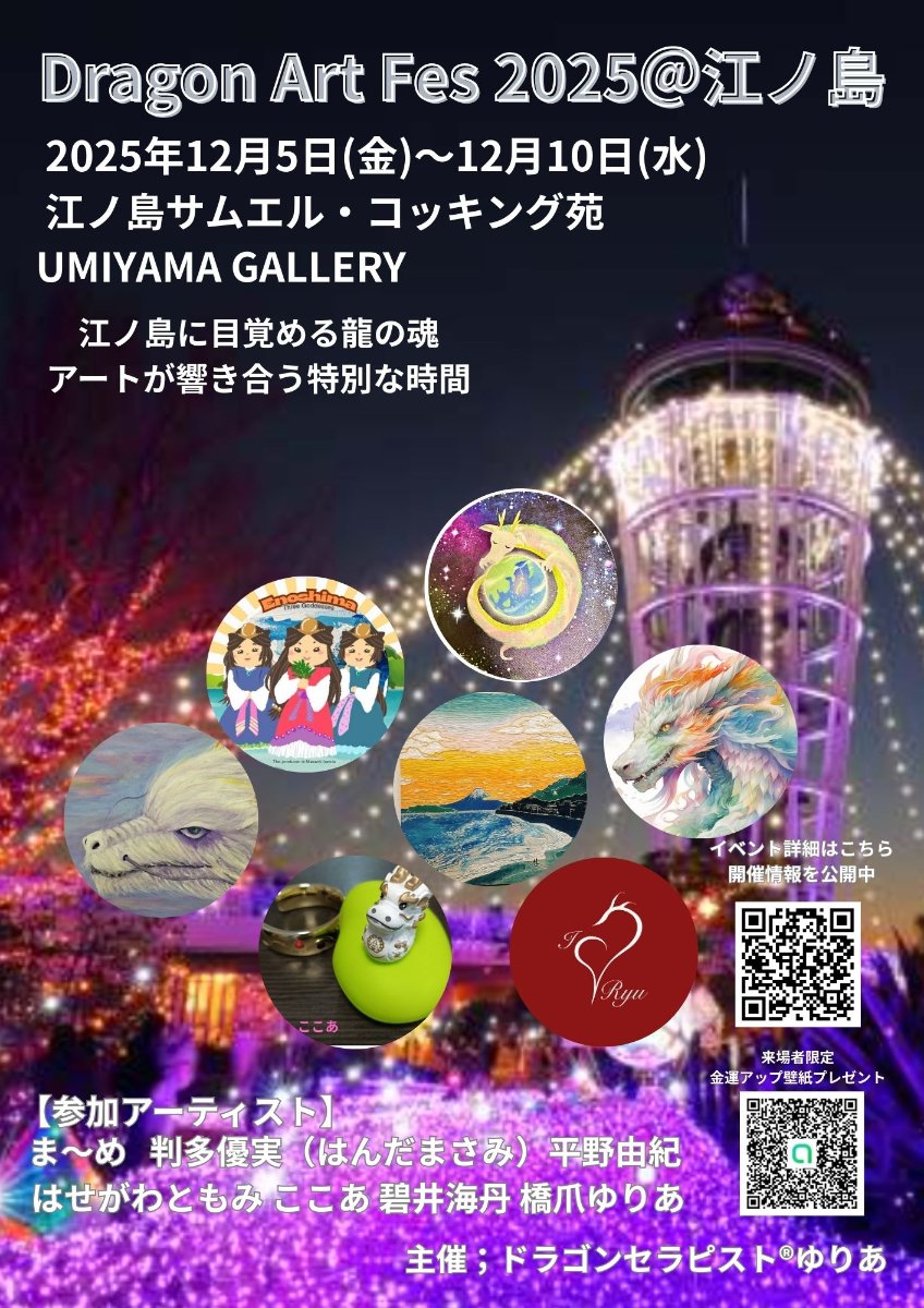 江ノ島に目覚める龍の魂 アートが響きあう特別な時間 本格的な風の時代が始まりました。 キラキラのエネルギーの中で龍達が集まる祭典です!大きなエネルギー変化の時です。 そんな特別な時をパワースポット江ノ島で過ごしませんか?