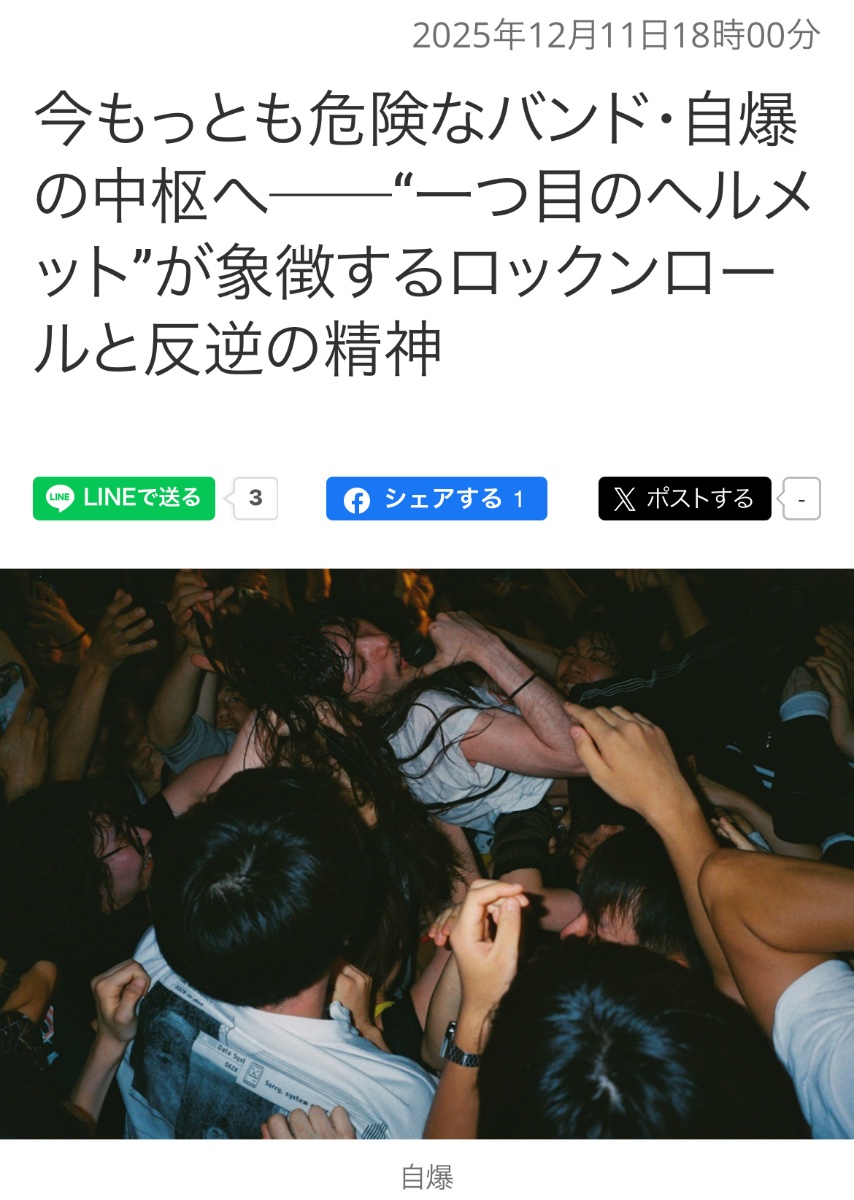 自爆 1st TOUR “大衆に告ぐ” 開催決定!! 2026年 2/11(水祝) 新松戸 FIREBIRD 2/23(月祝) 福岡 KIETH FLACK 3/8(日) 仙台 FLYING SON 3/27(金) 心斎橋 Live House Pangea 3/28(土) 名古屋 HUCK FINN 4/8(水) 下北沢 CLUB Que 4/19(日) 下北沢 BASEMENTBAR ※ゲストバンド有り --- 2025年 11/26 1st full album 『大衆に告ぐ』配信 12/17 初ワンマンライブ 渋谷CLUB QUATTRO(Thank You SOLD OUT!!)